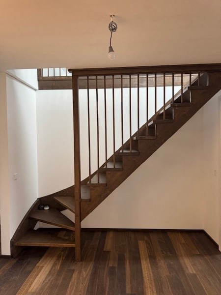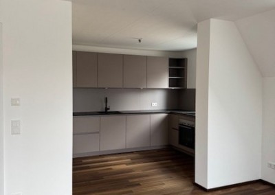 Die großzügig geschnittene Dachetage punktet mit ihrem offenen Grundriss und ist wie geschaffen für ein modernes Paar. Der Wohnraum samt Essbereich geht nahtlos in die Küche über, auf dem westseitigen Balkon lässt sich der Tag entspannt ausklingen. Im geräumigen Schlafzimmer ist die Ankleide integriert, das Bad ebenso qualitätvoll ausgestattet wie jene der 3-Zimmer-Wohnungen.